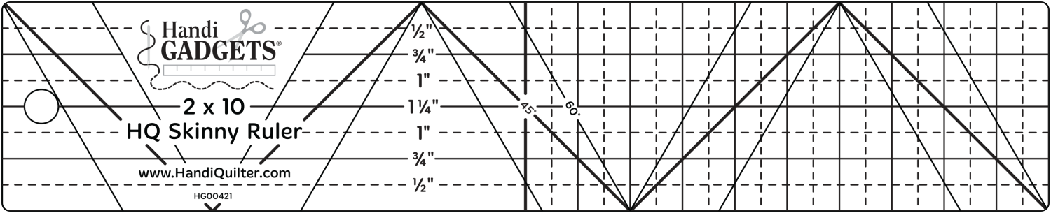 The HQ skinny ruler is a 2” by 10” straight edge ruler. The skinny design makes it easy to control while the length allows you to have to move the ruler less for straight lines.