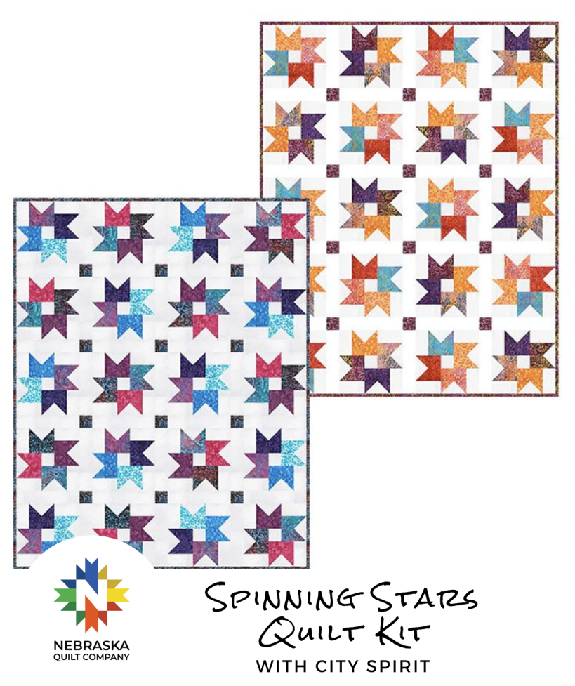 Spinning Stars Quilt Kit with City Spirit by Banyan Batik Studio includes everything you will need to complete the top and binding of this quilt and uses 100% batik cotton fabrics. Spinning Stars features 20 star blocks arranged in four rows of five. Backing will need to be purchased separately. Finished throw quilt size 46" x 58"