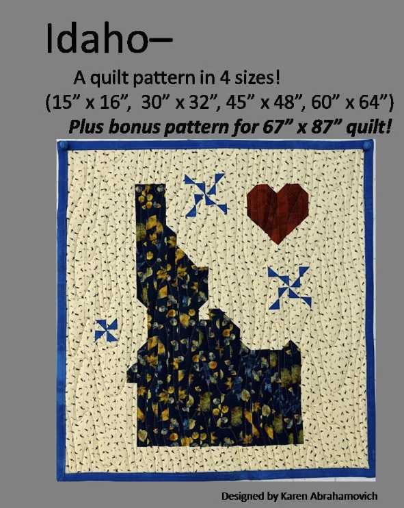 Idaho – known as the “Gem State” also and famous for its potato production of course! The finished quilt size is determined by the width of the strips used for construction. Strip widths range from 1" to 2.5" and a detailed construction "map" guide provides details needed to produce a great quilt! Quilt size options are 13" x 16", 26" x 32", 39" x 48", 52" x 64" Sizes vary for multiple wall hanging options (the smallest also is a great size for a pillow) or go big for a great throw quilt.Idaho Quilt Pattern
