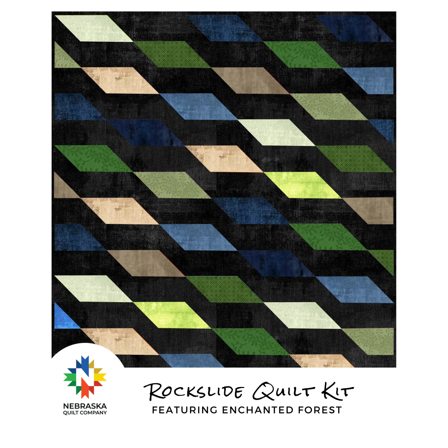 The Rockslide Quilt Kit is a beginner level, charm pack and layer cake friendly pattern. Using Enchanted Forest by Wilmington Prints, the look is masculine. This kit contains just over 6 yards of fabric to create the quilt top and binding; batting and backing sold separately. Backing recommendations 40/45" Wide: 6 yards, 108" Wide: 2 1/2 yards, or 90" Wide: 3 yards.