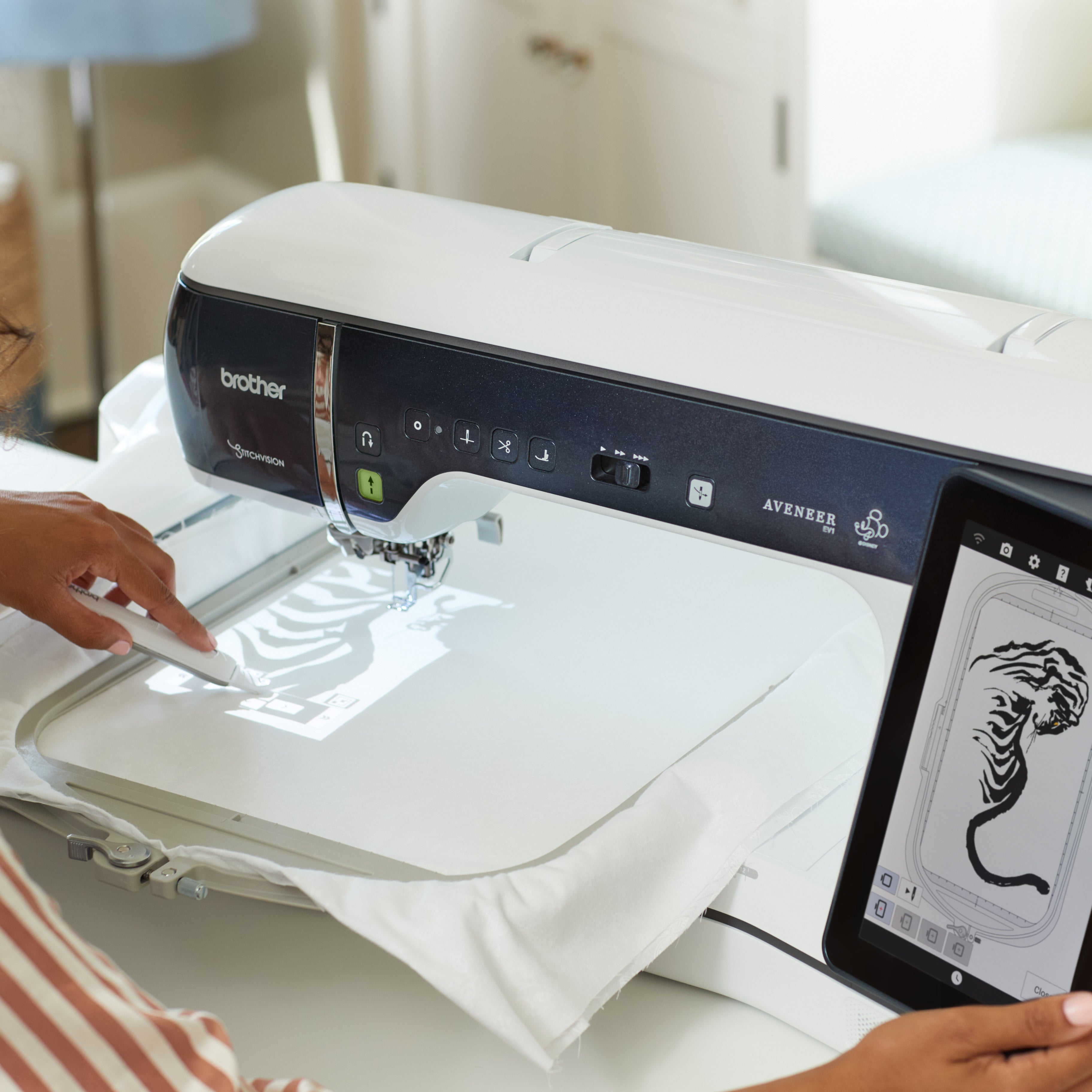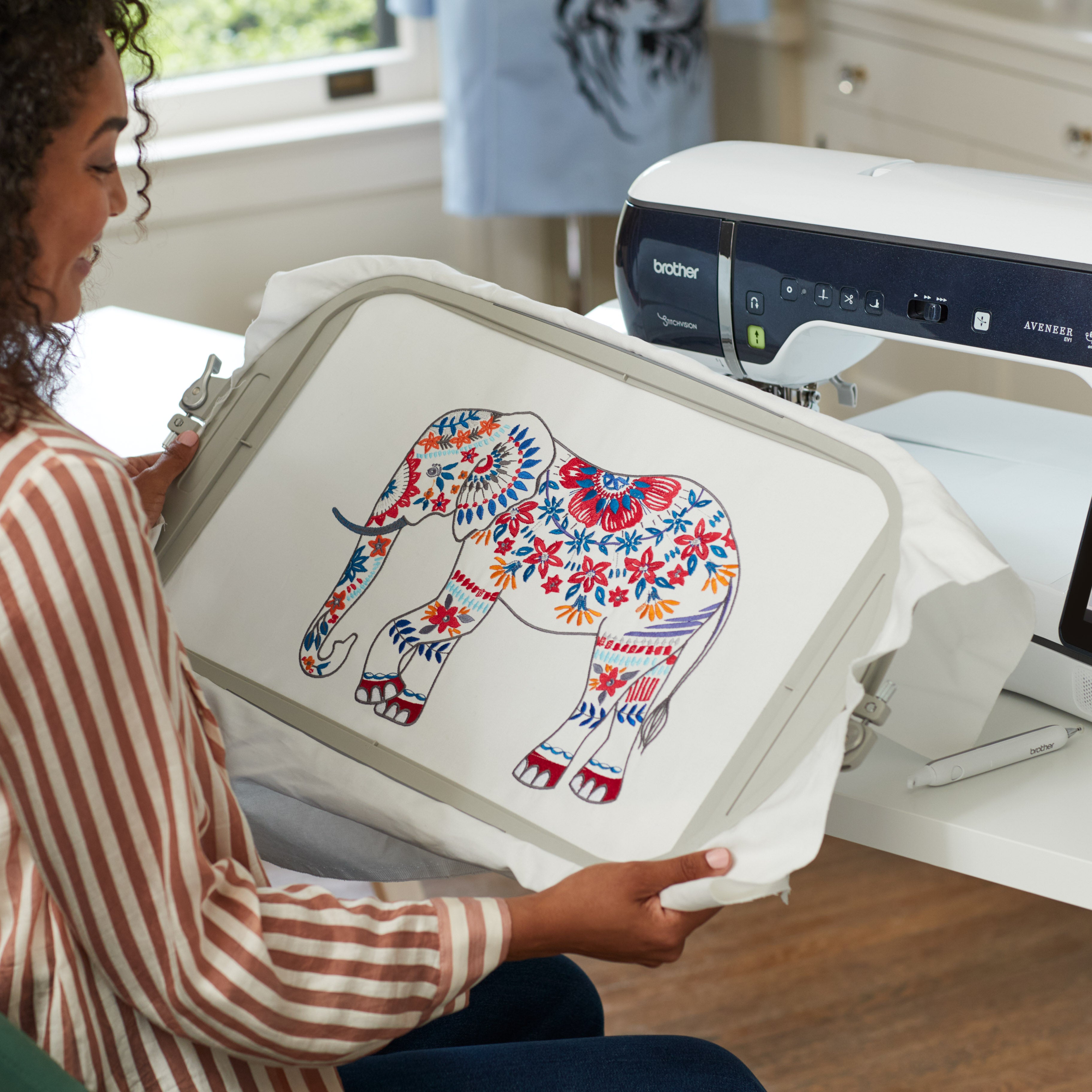 An industry-leading 14.1” workspace (70 square inches) from needle to arm handles everything from large home décor projects to upcycled creations. The large 11 5/8” x 18 1/4” embroidery frame is the largest and most advanced embroidery frame ever offered by Brother. Project stitches or designs onto an 8” x 5” projection area for precise placement and edit directly on fabric, such as moving, resizing, and rotating. When multiple designs are in place, selecting a specific object for editing is easy.