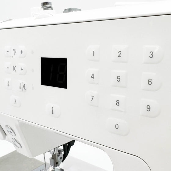 Press the Start/Stop button to sew without the foot control. Makes sewing long seams, free-motion and buttonholes easy.