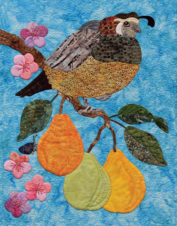The December block includes a quail, a pear tree branch, and a butterfly. The blossoms look rich and shaded when using several different variations of pink fabrics, or make them from just one if you prefer to keep it simple.