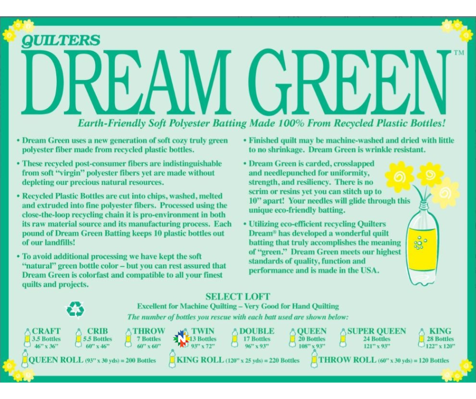 Each pound of Dream Green Batting keeps 10 plastic bottles out of our landfills. Plastic bottles are cut into chips, washed, melted and extruded into fine polyester fibers. These recycled fibers are indistinguishable from “virgin” polyester fibers yet are made without depleting our precious natural resources. To avoid additional processing we have kept the soft “natural” green bottle color – but you can rest assured that Dream Green is colorfast and compatible to all your finest quilts and projects.