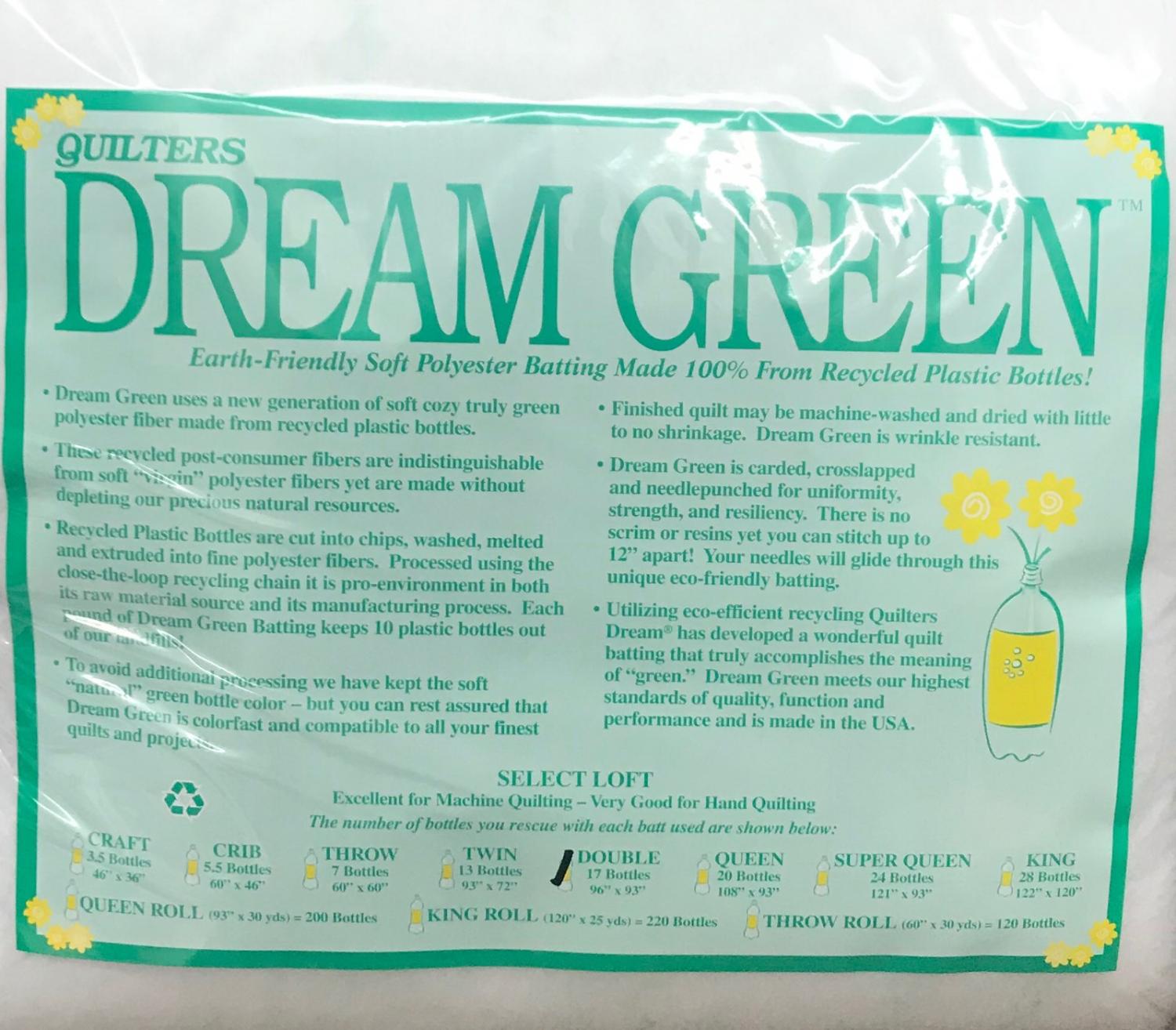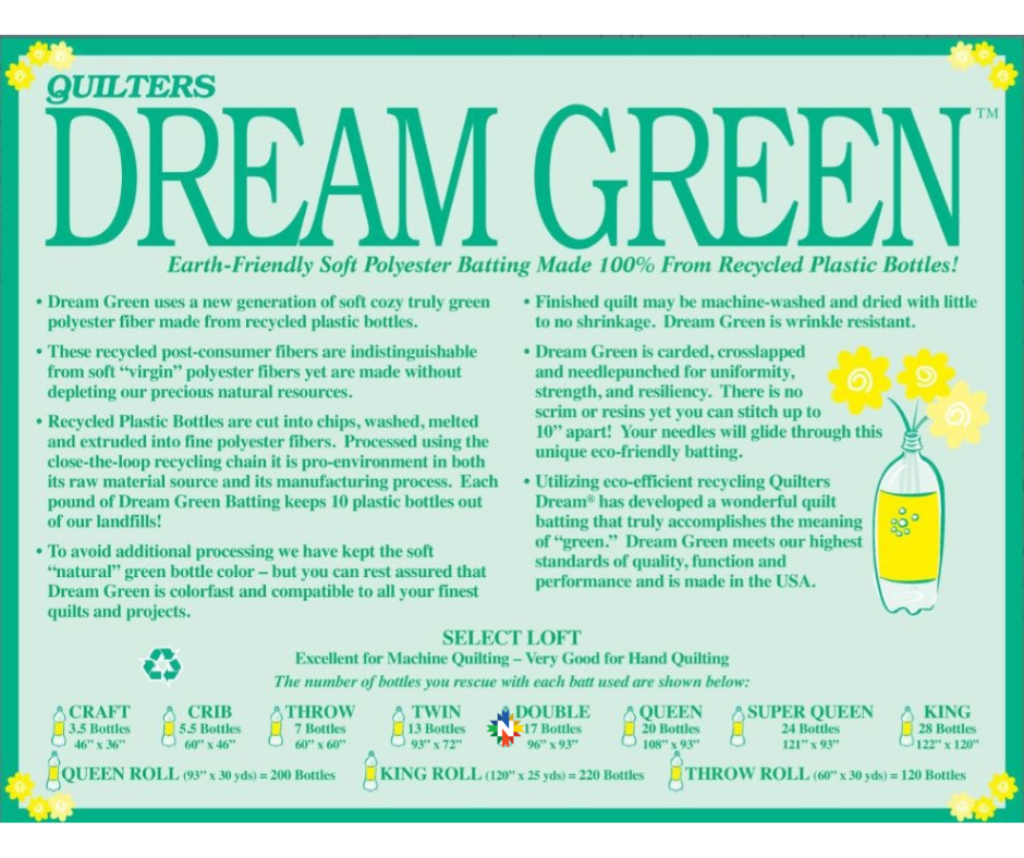 Dream Green is a soft, cozy batting made 100% from recycled plastic bottles! Dream Green meets our highest standards of quality, function, and performance. Your needles will glide through this unique eco-friendly batting. Finished quilt may be machine-washed and dried with little to no shrinkage. Dream Green is wrinkle-resistant.