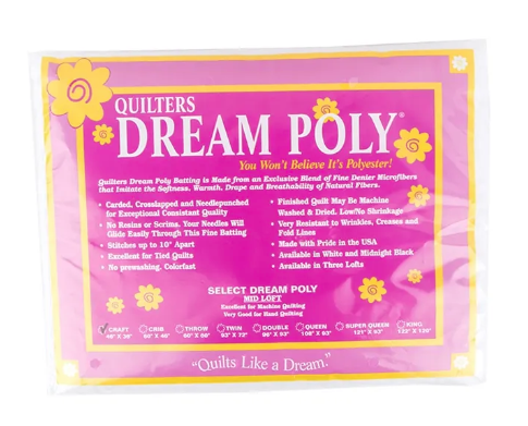 - Dream Poly resists bunching and shifting and is strong enough to stitch up to 12" apart giving the quilter incredible freedom of design.