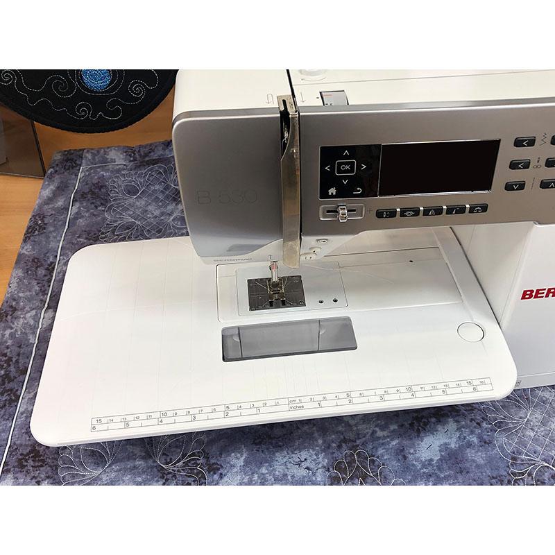 The Slide-on Table is a handy extension to the free arm for BERNINA sewing machines that provides more room for your sewing projects while ensuring improved fabric feed. Free-arm function remains possible with the extension table in place, allowing for easy sewing of larger tubular or closed items such as skirt hems or bags. A seam guide enabling precise wide edgestitching is also available separately for the Slide-on Table.