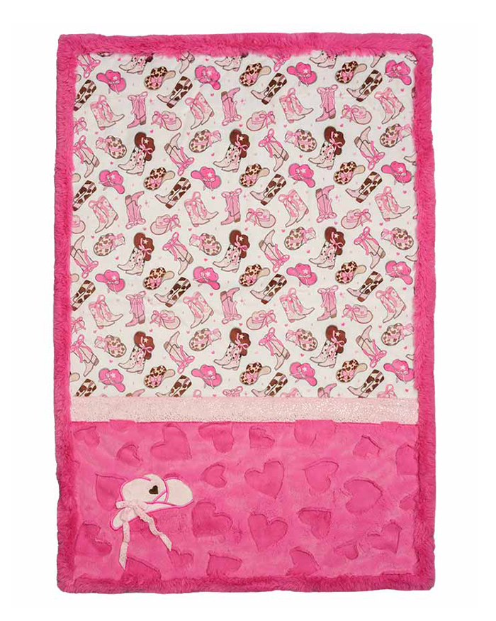 Little Miss Rodeo Lullaby Cuddle® Kit has fun cowboy boots and hats paired with silky soft, velvety plush Luxe Cuddle®. This complete fabric kit includes everything you need: fabric strips, a pattern, backing, and binding. The Lullaby Cuddle® Kit can be sewn two different ways: featuring a large bottom strip with a cowboy hat applique or an alternate strip version. Featuring fabrics Fancy Boots Digital Cuddle® Hot Pink, Glitter Sparkle Cuddle® Blush (it sparkles!), Hearts Luxe Cuddle® Fuchsia, and Bunny Luxe Cuddle® Fuchsia for binding. Backing fabric included Glitter Sparkle Cuddle® Blush.