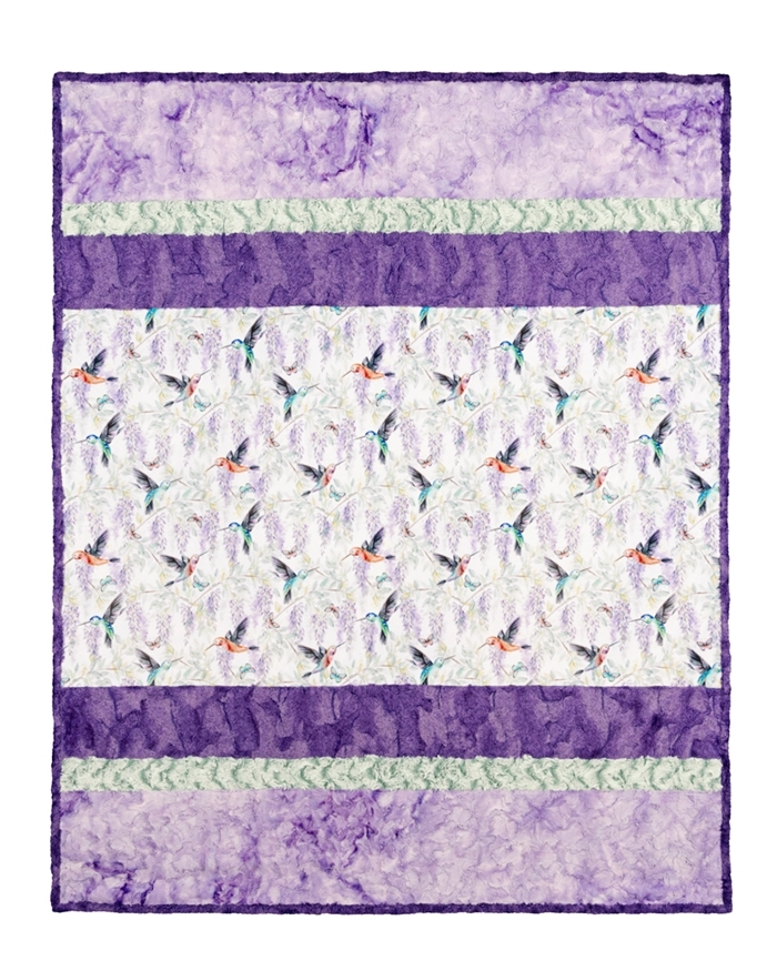 This beautiful quilt features our hummingbird print that captures the lightness and joy of these amazing animals, illustrated in a captivating watercolor-inspired style! Our Sensational Strips Cuddle® Kit Wisteria Hysteria includes pre-cut strips of Hummingbird Digital Cuddle® Multi, Luxe Cuddle® Galaxy Bellflower, Luxe Cuddle® Alpine Pesto, and Luxe Cuddle® Heather Loganberry (also used for the binding).
