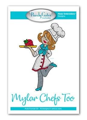 Mylar Chefs Too is a lively collection of whimsical chefs with unique kitchen and cooking phrases all highlighted by the fabulous shine of Mylar Embroidery ®. The phrases come separately or combined with the chefs in different sizes. Mylar Chefs Too is a machine embroidery collection that is the perfect ingredient for fun!