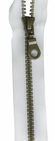 Closed Bottom Zipper. Antique brass-like zipper in Vislon construction. Non-locking slider with donut style pull. Ideal for jackets, vests, sweaters and other outerwear applications.