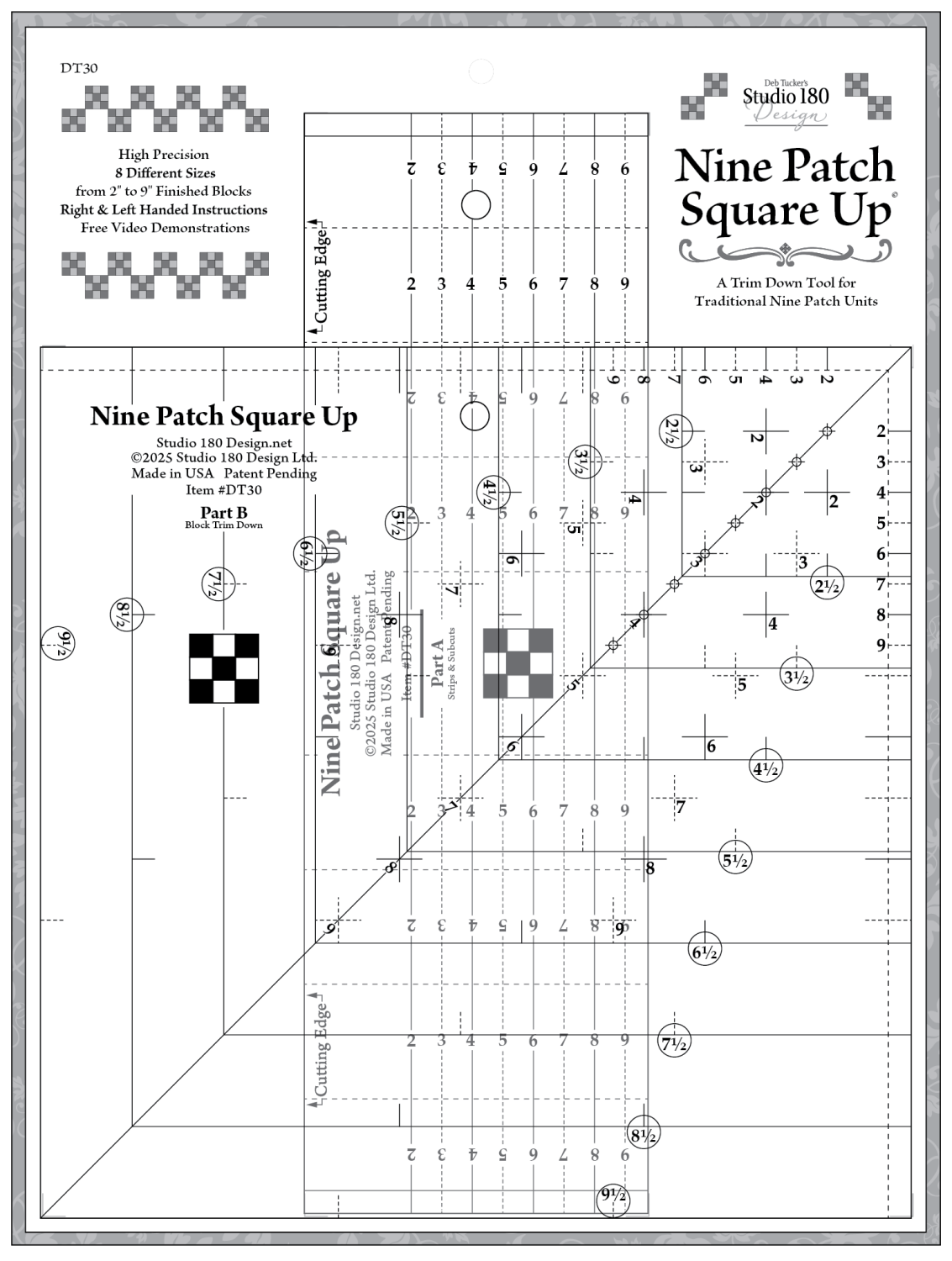 This two part tool set comes with the basic instructions for making nine patch units that finish from 2” up to 9” in whole inch increments.
