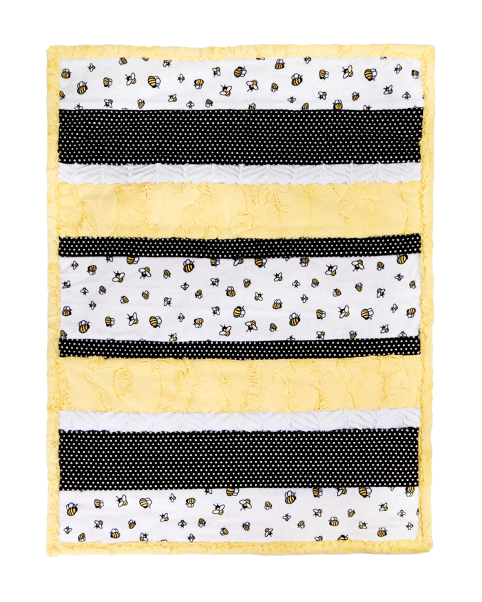 Buzz, buzz, buzz! This darling quilt kit features our Bees-A-Buzz Cuddle® print with illustrated bees of all shapes and sizes, and will quickly be an inseparable naptime companion for any little baby boy or girl. Our Bambino Cuddle® Kit Bee Happy includes Bees-A-Buzz Digital Cuddlev Sunshine, Swiss Dot Cuddle® Black/Snow, Luxe Cuddle® Ziggy Snow, and Luxe Cuddle® Hide Banana for the top, binding and backing. This Bambino Cuddle® kit quilt is approximately 28" by 37" and includes a pattern and strips for the quilt top, backing and binding.