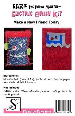 Kit to make 1 kid size Earie - The Pillow Monster™ Make a New Friend Today! Kit includes: pre- cut fur, ric rac teeth, assorted buttons for eyes, felt for ears and eyes, and freezer paper. Just add fabric! You will need (2) 13" scrap pieces or (1) 13" scrap piece and 1 fat quarter.