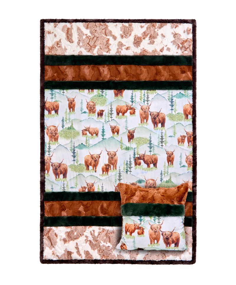 Cuddle® Cattle Co. Picture Perfect Cuddle® Kit features charming Highland cows on picturesque hills paired with silky soft, velvety plush Luxe Cuddle®. This fabric kit includes: fabrics for the quilt top and pillow, patterns, and binding. Featuring fabrics The Highlands Digital Cuddle® Snow, Baby Calf Luxe Cuddle® Woodland, Encore Luxe Cuddle® Forest, Hide Luxe Cuddle® Woodland, and Hide Luxe Cuddle® Chocolate for binding. Backing fabric not included but we recommend any Luxe or C3 in Woodland, Forest, or Autumn in 1 1/8 yards. We recommend a coordinating 2-yard precut like CKLC2SP Calf Penny or Frosted Himalayan Autumn!