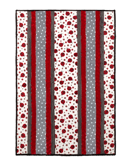 As snug in a bug in a... minky fabric quilt! Our Fabulous 5 Cuddle® Kit Lovebug includes our Lady Bug Digital Cuddle® Scarlet print that is covered in spherical ladybugs interspaced between cute flower and hearts, and the kit also includes our Swiss Dot Black/Snow, Luxe Cuddle® Marble Scarlet, Cuddle® 3 Black and Alotta Dots Cuddle® Graphite fabrics. This Fabulous 5 Cuddle® kit is approximately 38" by 58" and includes a pattern, five pre-cut 10" strips and binding, and we recommend using Cuddle® 3 Black for the backing (approximately 1 1/8 yards needed).