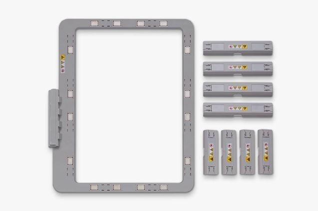The durable and lightweight 7x12” magnetic hoop consists of 2 frames and 8 magnet pieces, and this frame can embroider materials up to 2mm thick.