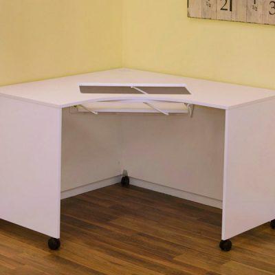 Meet MOD Corner Sewing Cabinet – the cabinet designed to save you space and maximize your sewing area! MOD Corner cabinet features a 2 position manual lift for free arm and flat bed sewing, and expansive workspace on all 3 sides of your sewing machine! This innovative design is perfect for bedrooms and apartments, and is built to work in unison with other pieces of the MOD Squad Complete Studio Set!