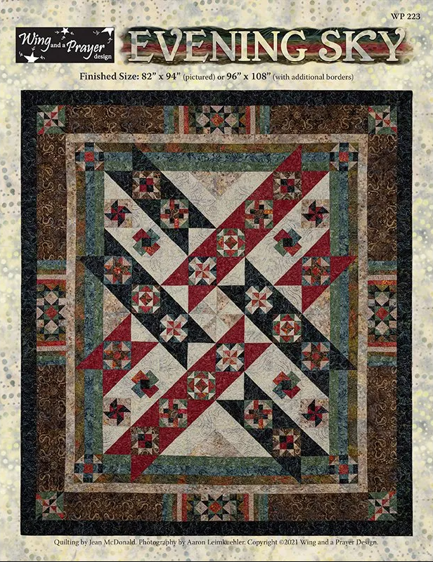 The Evening Sky collection features 10 Tonga batiks from Timeless Treasures in earthy cream, sage, russet, navy and brown. This quilt steps away from the standard 12” blocks and each month piecing is composed of four charming 6” blocks. The woven layout is a striking use of the smaller blocks, which continue into the border.