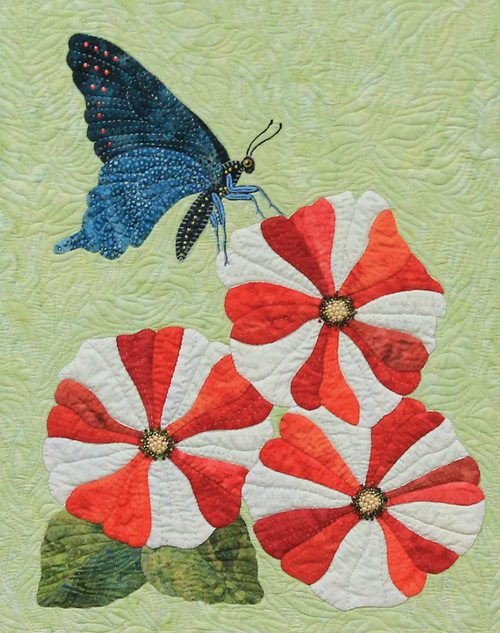 The July block features patriotic red and white petunias and a blue polka dotted swallowtail butterfly. Also included are three bonus files to add creativity to your projects.