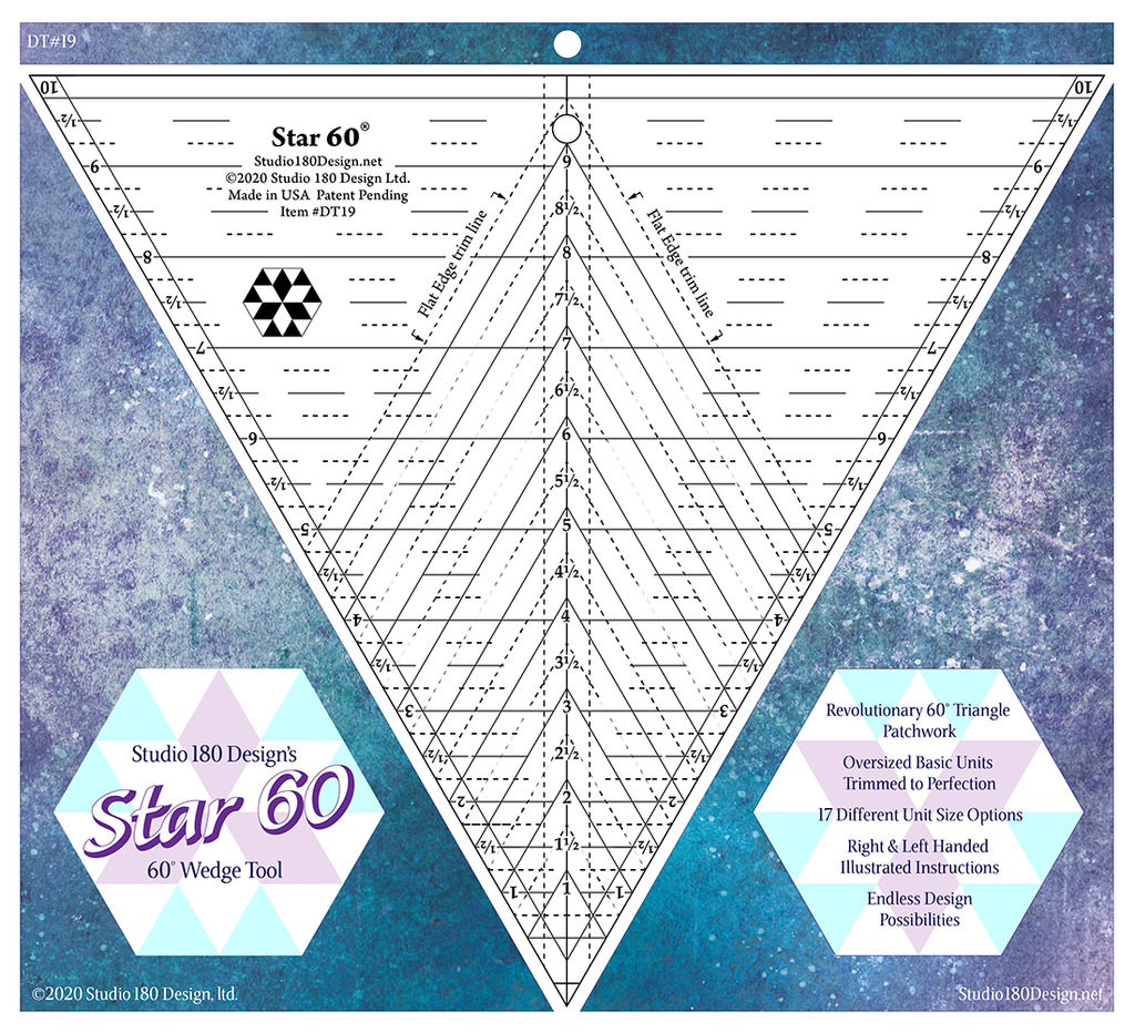 Are you ready to dive into the world of 60 degree quilting designs? Our Star 60™ tool brings the same concept of oversizing and trimming down into the realm of 60 degree shapes. We begin with a basic Star 60 unit, containing a diamond and two small triangles in 17 different size options, and then team this unit up with a multitude of additional shapes to create an array of amazing 60 degree quilt projects.
