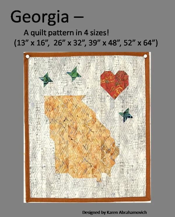 Georgia is the last of the original 13 Colonies and known for its subtropical climate. Also known as the Peach State. The finished quilt size is determined by the width of the strips used for construction. Strip widths range from 1" to 2.5" and a detailed construction "map" guide provides details needed to produce a great quilt! Quilt size options are 13" x 16", 26" x 32", 39" x 48", 52" x 64" Sizes vary for multiple wall hanging options (the smallest also is a great size for a pillow) or go big for a great throw quilt.Georgia Quilt Pattern