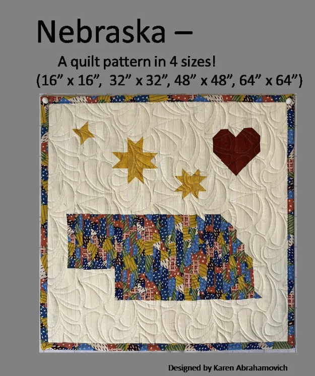 Nebraska – the Planter State known for site of the largest Mammoth Fossil. The finished quilt size is determined by the width of the strips used for construction. Strip widths range from 1" to 2.5" and a detailed construction "map" guide provides details needed to produce a great quilt! Quilt size options are 13" x 16", 26" x 32", 39" x 48", 52" x 64" Sizes vary for multiple wall hanging options (the smallest also is a great size for a pillow) or go big for a great throw quilt.Nebraska Quilt Pattern