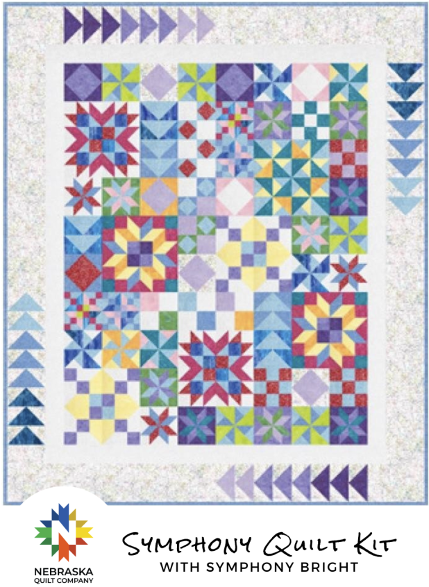 Symphony Quilt Kit with Symphony Bright Colorway is designed by Linda J. Hahn and Deborah G. Stanley of Frog Hollow Designs. Symphony features Panels, inspirational quotes, soft natural colors, pieced blocks included for interest. The kit includes everything needed to complete the top and binding for this quilt and finishes at throw quilt size 66" x 78".