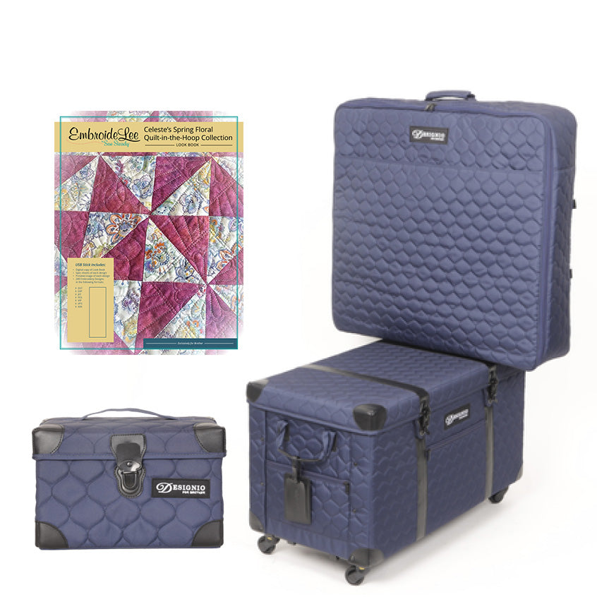 This fantastic bundles comes with the purchase of a Brother Celeste cX1e Embroidery machine. Luggage, notions case, and a Embroidilee Design Set Spring Floral In-the-Hoop Quilting Set exclusively made for Brother.