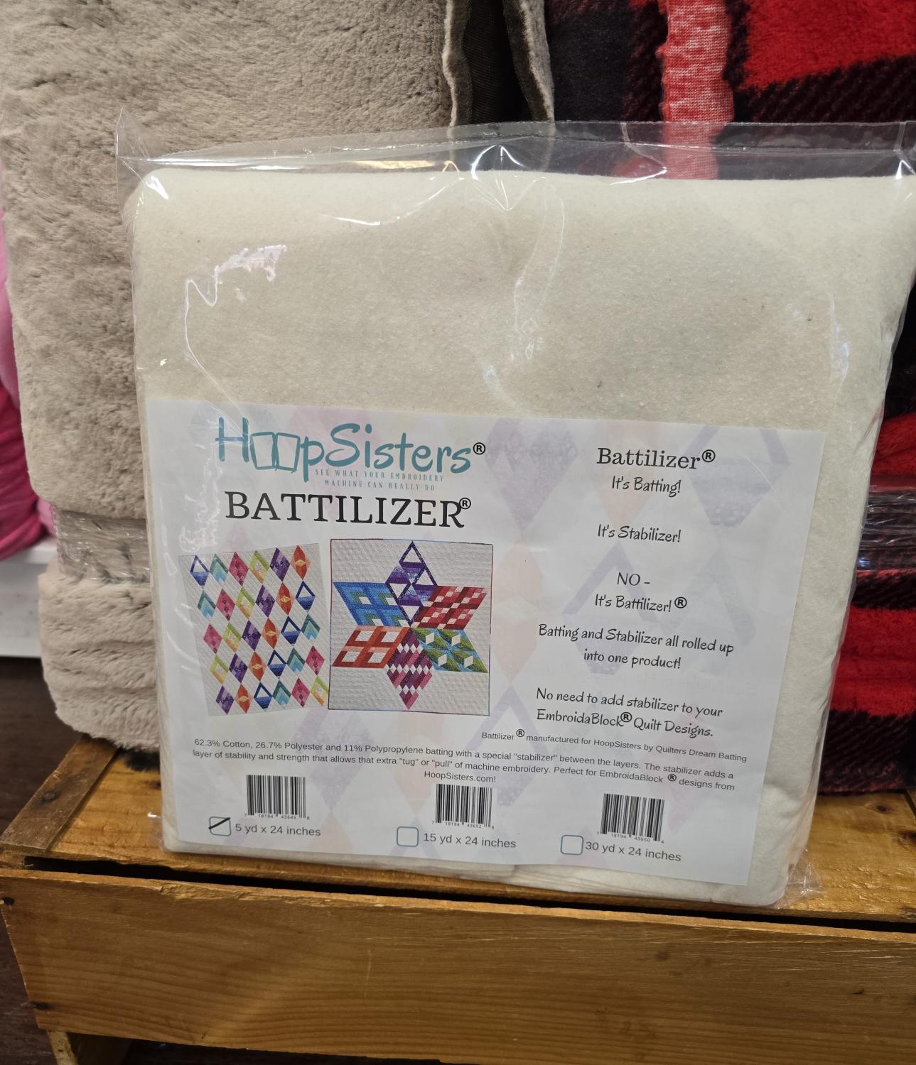 62.3% cotton, 26.7% polyester and 11% polypropylene batting with a special "stabilizer" between the layers. The stabilizer adds a layer of stability and strength that allows that extra "tug" or "pull" of machine embroidery.