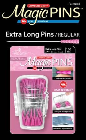 Comfort Grip, Heat Resistant, 100pc. Taylor Seville Originals Notions make your sewing life easier. The Comfort Grip Magic Pins Extra Long are 2.25in and .6mm. They have a comfort grip head that makes picking up and maintaining a grip on the pin, easy. The Comfort Grip Magic Pins are also heat resistant, so if you iron over them, they will not be ruined. The pins come in a designer storage case that closes, so you won’t lose any pins!