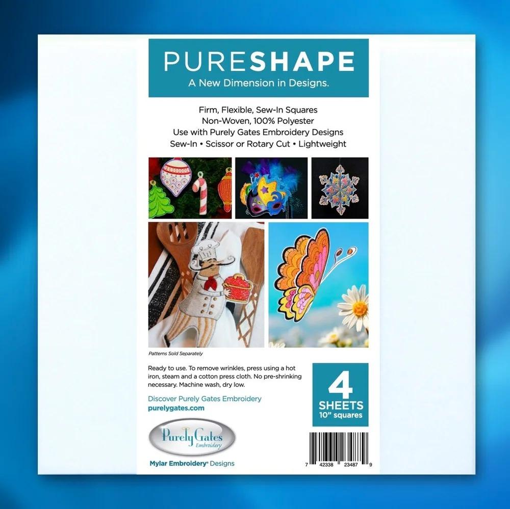 Bring Purely Gates Embroidery Designs to life with PureShape Sheets! These 100% polyester sheets are firm, flexible sew-in squares that are lightweight and ready to use. Stitch a Purely Gates Embroidery Design on PureShape, trim it out with scissors and you have a dimensional design that sparkles! Perfect for ornaments, masks, napkin rings or anything you can imagine! Use the same thread color in the bobbin to create two-sided designs as well. PureShape is machine washable and iron-friendly. Make your next project 3D with Purely Gates PureShape Sheets!