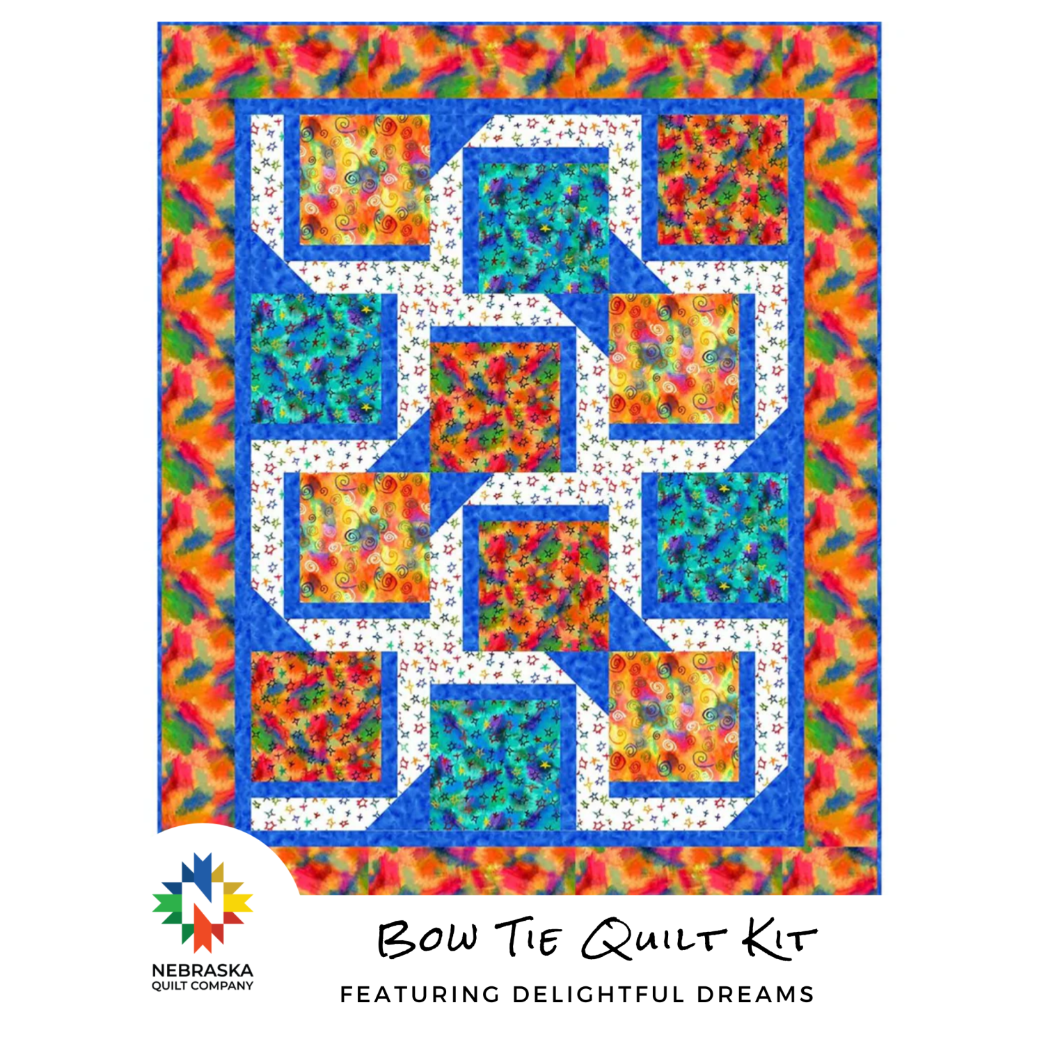 The Bow Tie Quilt Kit is designed by Kari Nichols of Quilting Renditions for QT Fabrics. Using bright colors and swirls and stars the Delightful Dreams collection by Josie for QT Fabrics makes this quilt pattern an exciting visual experience. This kit contains over 4 yards of fabric to create the quilt top and binding; backing sold separately. Backing Recommendations: 40/45" Wide: 3.5 yards; 108" Wide: 1 7/8 yards.