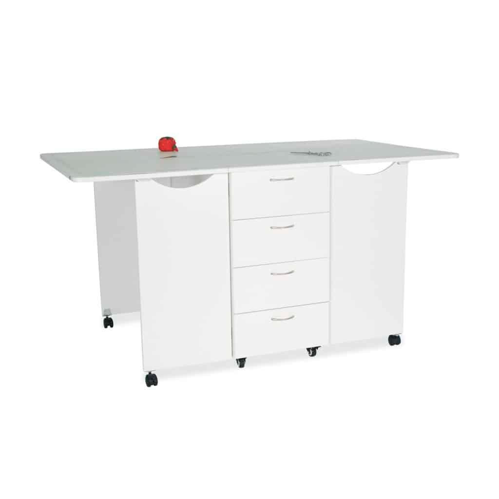 Kangaroo’s premiere cutting table is the perfect addition to your sewing and crafting studio! Kookaburra’s timeless design and elegant fixtures provide storage, convenience and function – along with an expansive 70″ x 40″ worksurface! Kookaburra sits on 8 heavy-duty casters to provide stability, easy mobility and 360° access. Even better – Kookaburra’s 2 side leaves fold down to 20″ x 40″ to easily store when not in use! 4 storage drawers on the front, 4 storage shelves on the back, and 1 beautiful cutting table to help elevate your sewing and crafting experience!