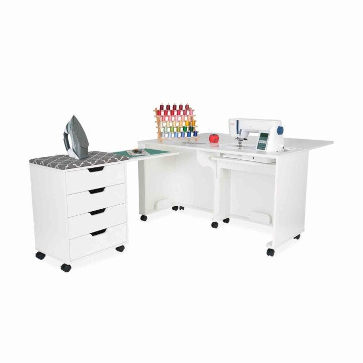 • Expandable caddy provides ironing, cutting workspace and storage for notions