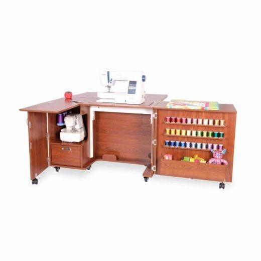 One of 3 signature sewing cabinets from Kangaroo Sewing Furniture, Wallaby is a dynamic, full-size sewing cabinet ready to elevate your sewing and quilting adventures! Wallaby features a 3 position hydraulic lift for free arm and flat bed sewing, and dynamic storage solutions for your serger, thread and other sewing notions! Wallaby’s expansive worksurface is highlighted by a foldable rear quilt leaf to keep large quilting projects from falling to the floor! Keep all of your sewing materials in immediate reach, and add style, comfort and convenience to your growing sewing studio!