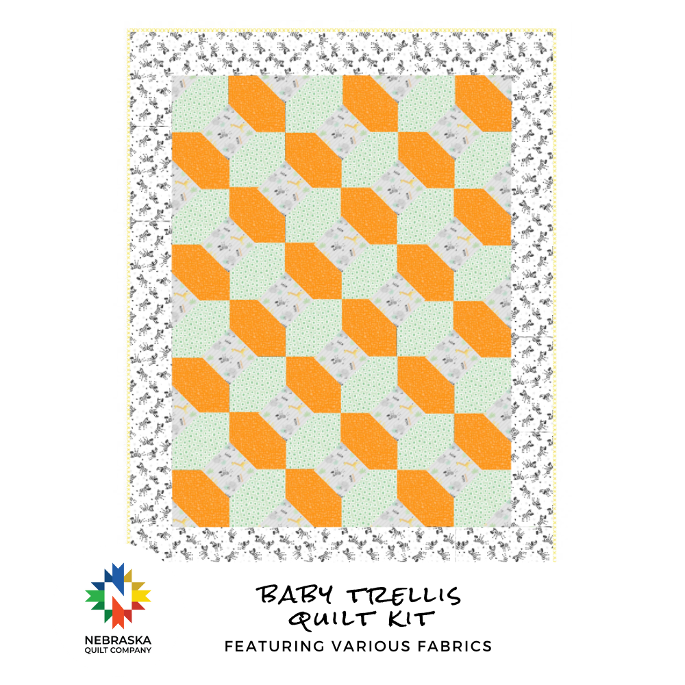 The Baby Trellis features various fabrics. Using jungle and geometric shapes to create a childrens safari quilt. This kit contains over 2.5 yards of fabric to create the quilt top and binding; batting and backing sold separately. Backing recommendations: 40/45" wide: 1.5 yards.