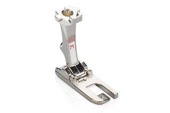 Use it to sew two-step flat-felled seams on jeans or sportswear simply by sewing the layers wrong sides together. A channel on the left of the presser foot tip holds the turned-under fabric in place for the second line of stitching.