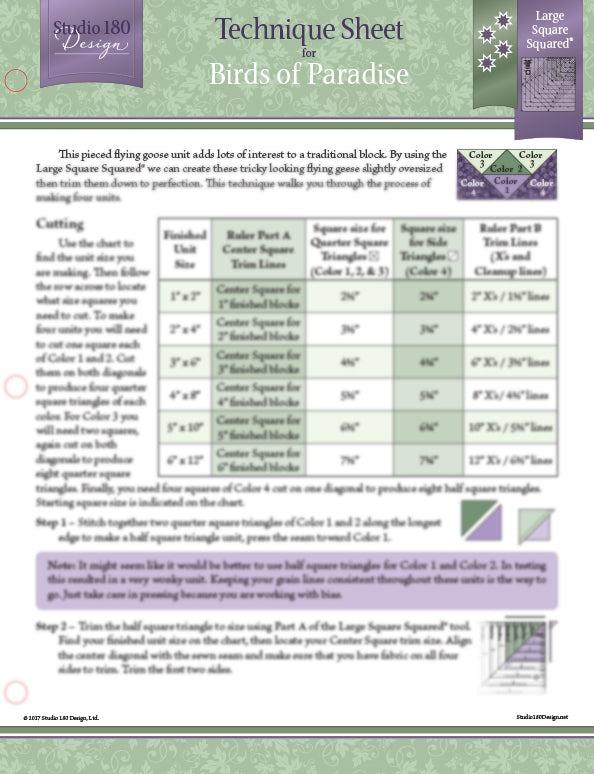 This pieced flying goose unit adds lots of interest to a traditional block. By using the Large Square Squared we can create these tricky looking flying geese slightly oversized then trim them down to perfection. This technique walks you through the process of making four units. The included chart gives you cutting dimensions for six different sizes, from 1” x 2" to 6" x 12” finished units. Fun block suggestions also included.