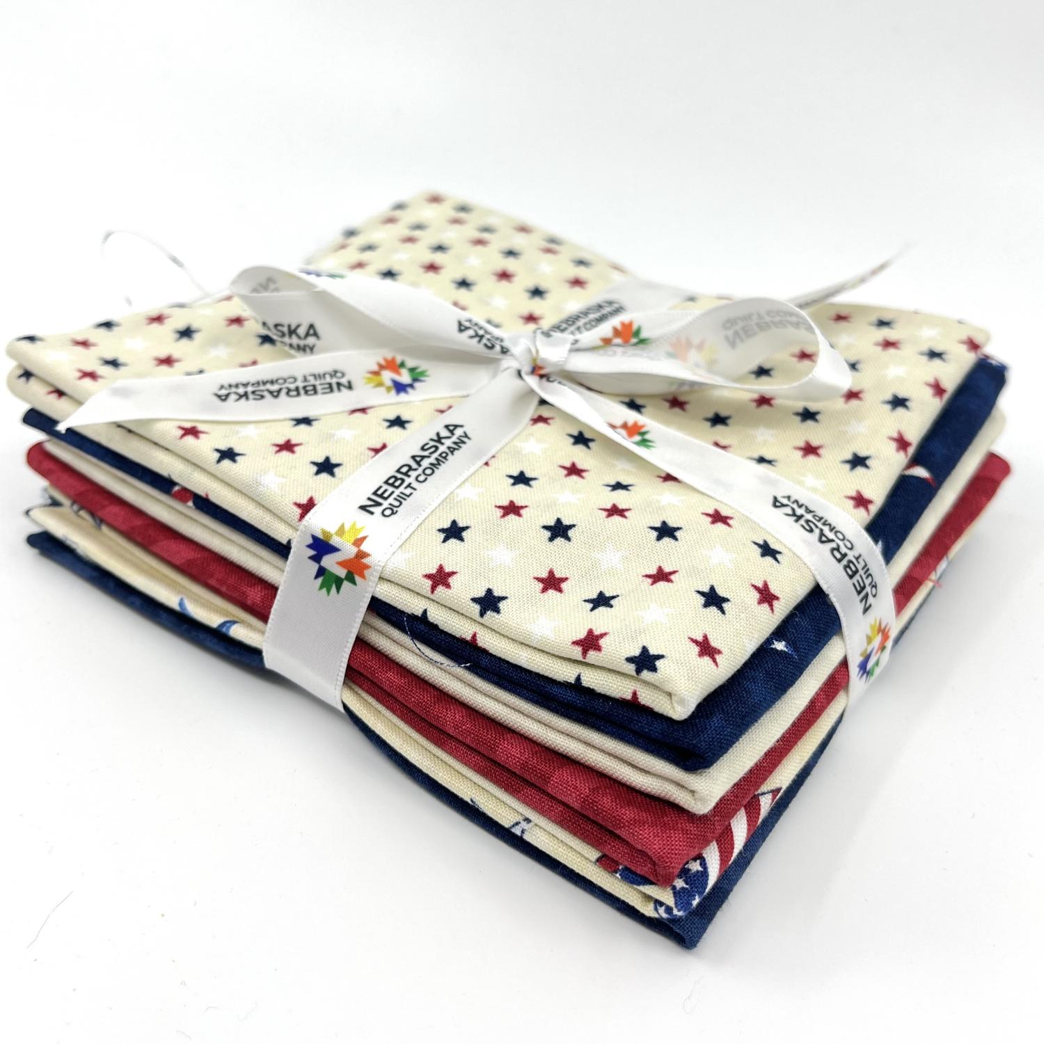 Patriotic fabrics calling. We need to be made into a quilt! Pick up this 6 piece Fat Quarter Bundle today!