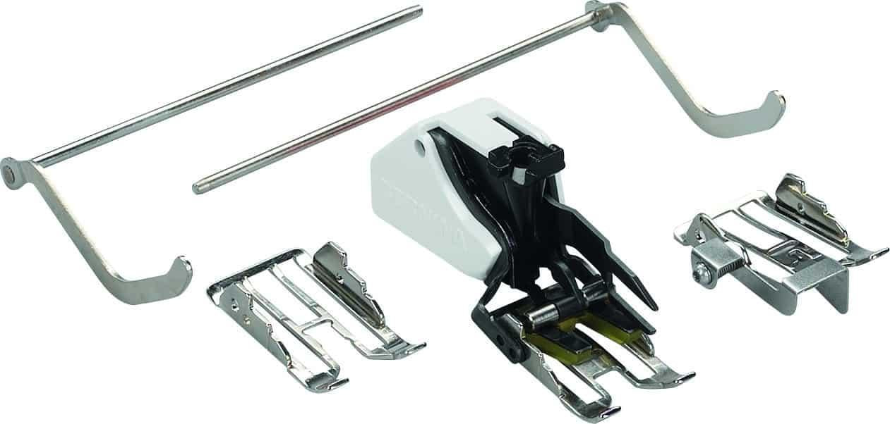 Three-Sole Walking Foot with Seam Guide #50 features a standard sole, a special quilting sole, and a sole with a central guide for edgestitching and stitching in the ditch. In addition, its two seam guides help you sew accurately. The result: projects with consistent stitching and perfectly matched patterns.