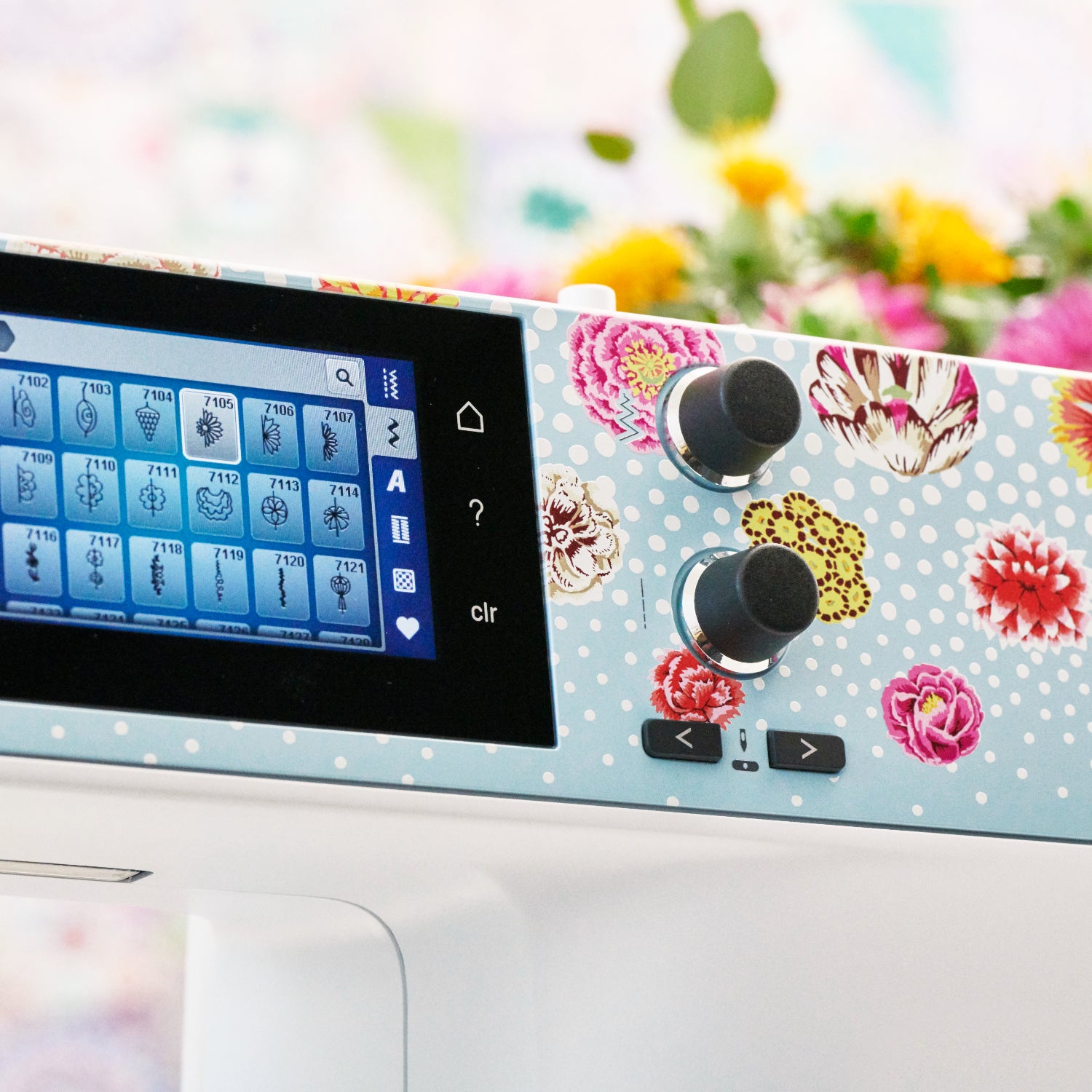Bring color to your sewing room with the unique machine design chosen by Yaya Han. The machine features lavender-colored parts with a mix of blue and purple hexagon elements, giving the machine an elegant and futuristic look. Even the included embroidery module is partially colored!