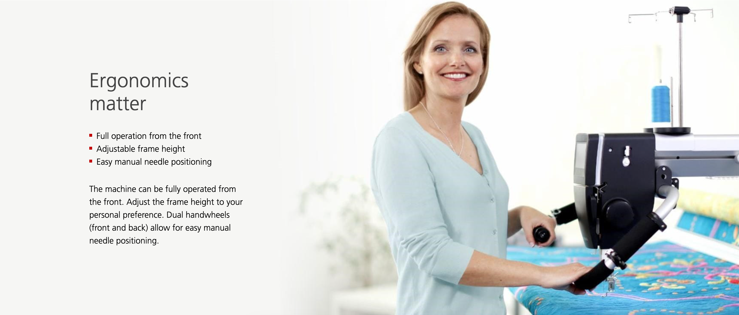 The most frequently used functions are right at your fingertips. Fully-adjustable 8-way handles offer comfort, whether stitching edge-to-edge or custom motifs, reducing any potential fatigue. Simply quilt in your preferred position.