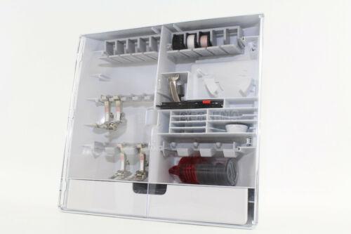 The practical BERNINA Accessories Box stores your Presser Feet, Bobbins, Needles and tools neatly so they are always visible and easily accessible. The Accessories Box can be kept on the sewing table.