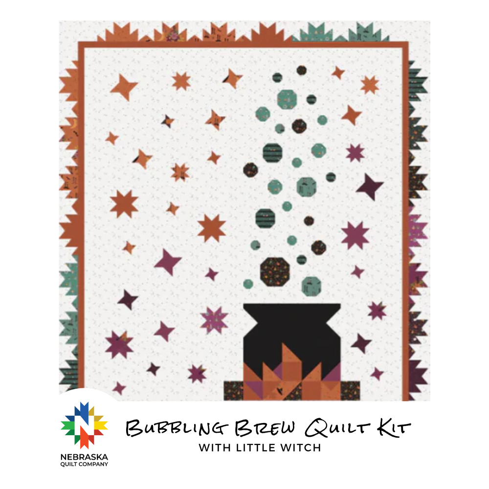 Bubbling Brew Quilt Kit with Little Witch designed by Jennifer Long for Riley Blake uses 100% Cotton fabrics and finishes at the size of 74" x 86". This kit includes all materials needed for the quilt top and binding, backing and batting will need to be purchased seperately.