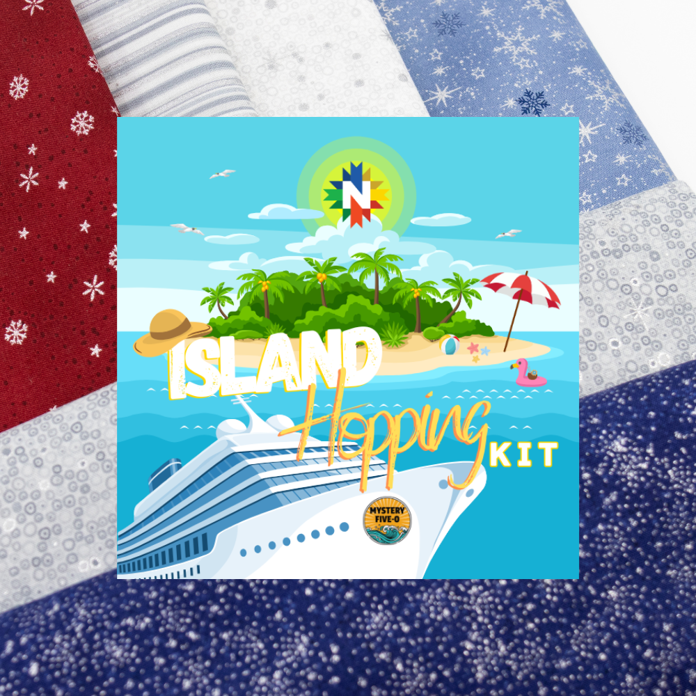The Mystery Five-0 #2 - Island Hopping featuring We Love Christmas (Version 1). Creating a great effect with two setting options. This kit contains over 9.3 yards of fabric to create the quilt top and binding; batting and backing sold separately. Backing recommendations: 40/45" wide: 5.5 yards.