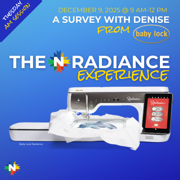 We are looking for you to come and join us for the NQC Radiance Experience. Sewing, quilting, and embroidery enthusiasts who have never sewn on the new Baby Lock Radiance are invited to give their thoughts on this machine. The goal is to receive valuable, first-impression feedback on current features. Not only will you get to sew on a fun new machine, but your feedback can influence new features!