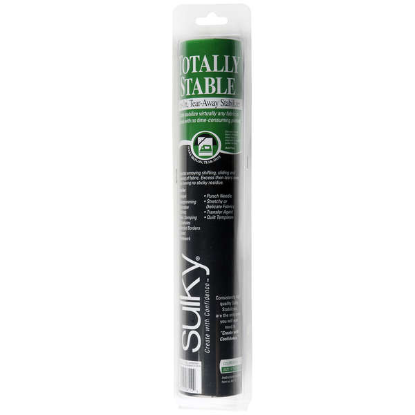 White - 12in x 12yd. Sulky Totally Stable stabilizer is a temporary, iron-on, tear-away stabilizer that is perfect for knits and stretchy fabrics. It ''totally" stabilizes in seconds with no time-consuming pinning. Eliminates shifting, sliding and puckering, then tears away easily, leaving no sticky residue. All Sulky stabilizers are acid and lead free. Our packaged size stabilizers are great for trying out or for smaller projects.